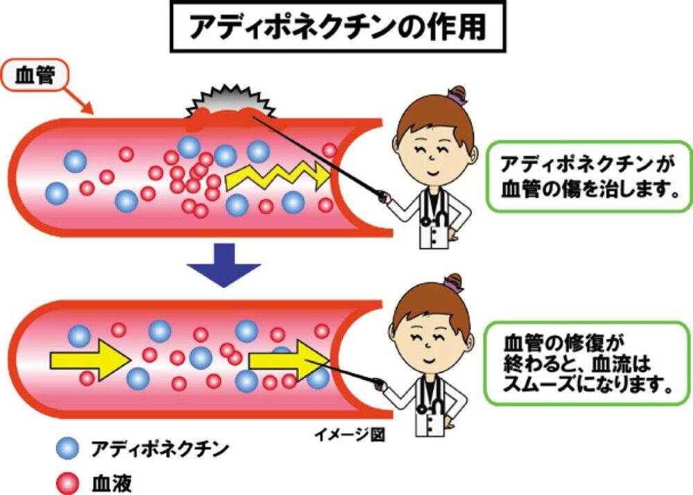 アディポネクチンとは、脂肪細胞から分泌される善玉ホルモンのことで、血管保護作用や動脈硬化抑制などの効果がある長寿ホルモンともいわれています。