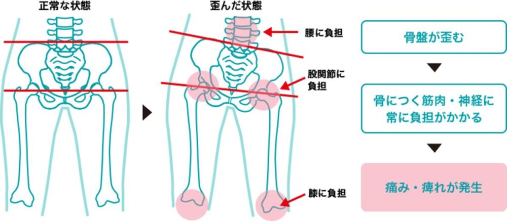 「使いすぎ」「使わなさすぎ」で筋肉が凝り固まると、硬い筋肉により骨がひっぱられ、骨格や骨盤にゆがみが出てきます。