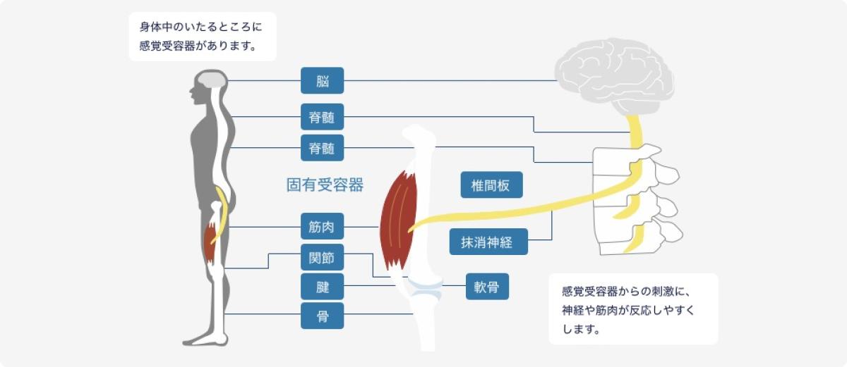 筋・腱・皮膚などの組織内には、身体の位置や動きに関する情報をもたらす「固有受容器」と呼ばれるものが存在します(筋:筋紡錘、腱:ゴルジの腱器官、関節:関節の受容器、内耳:前庭迷路受容器など)。