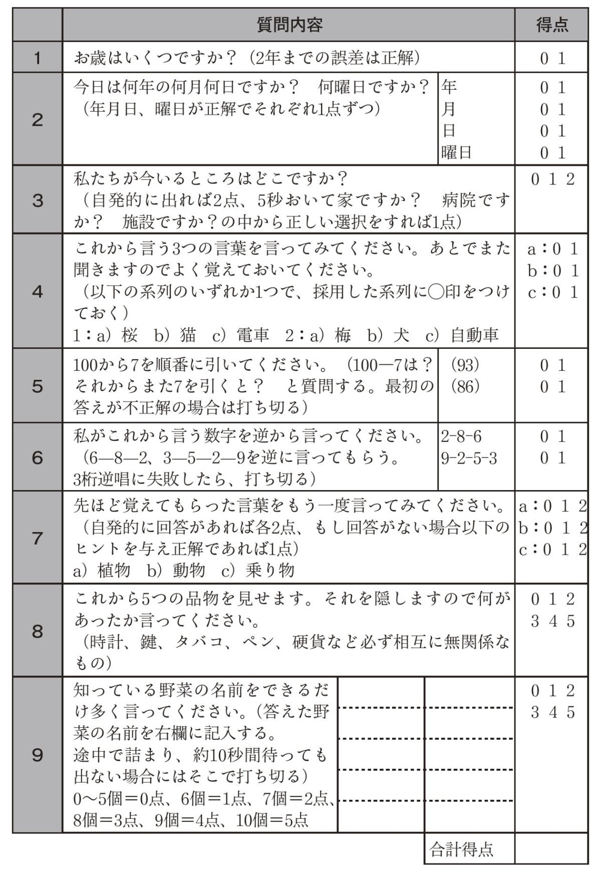 ・長谷川式簡易知能評価スケール…全部で9つの問いに答えてもらうことで認知機能を評価します。