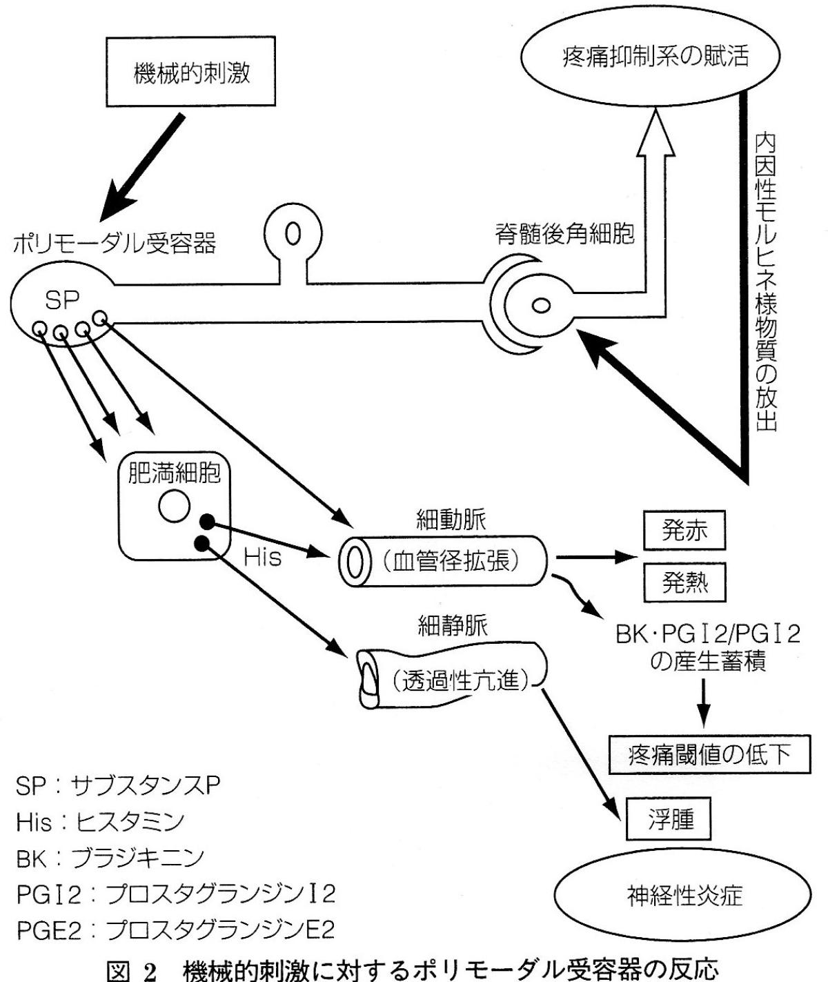 機械的刺激がポリモーダル受容器に入力されると、局所の血管拡張、透過性亢進による発赤、発熱、浮腫そして疼痛閾値の低下が現れる。