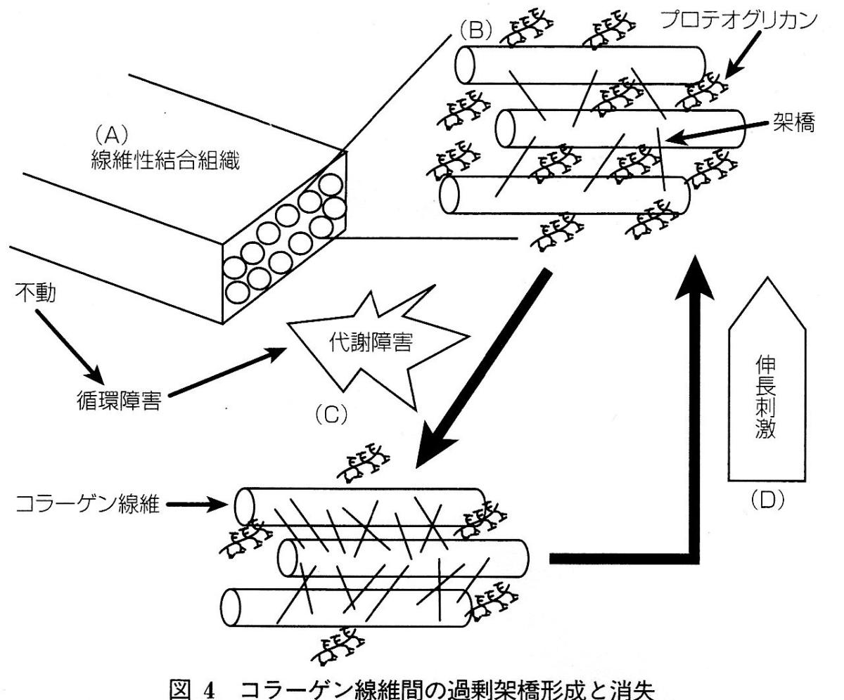 コラーゲン線維に機械的刺激を入力することによりコラーゲン線維間および線維内の過剰な架橋が減少するという生体反応が出現する。(関節周囲軟部組織伸展性の改善)