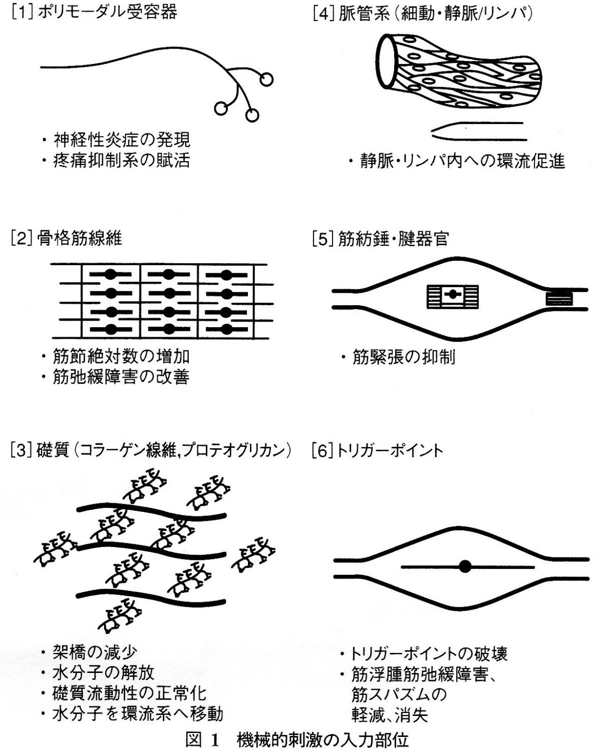 礎質に機械的刺激を入力することによりプロテオグリカンにとらわれ、移動できない水分子が自由に移動かのな水分子になるという生体反応が出現する。(局所循環の改善)