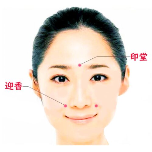 「香りを迎える」とのように、鼻の通りをよくするツボです。鼻の両脇、犬歯の根元を感じる辺りにあるツボで、両手の人差し指でギュッと押すようにして刺激をするとよいでしょう。