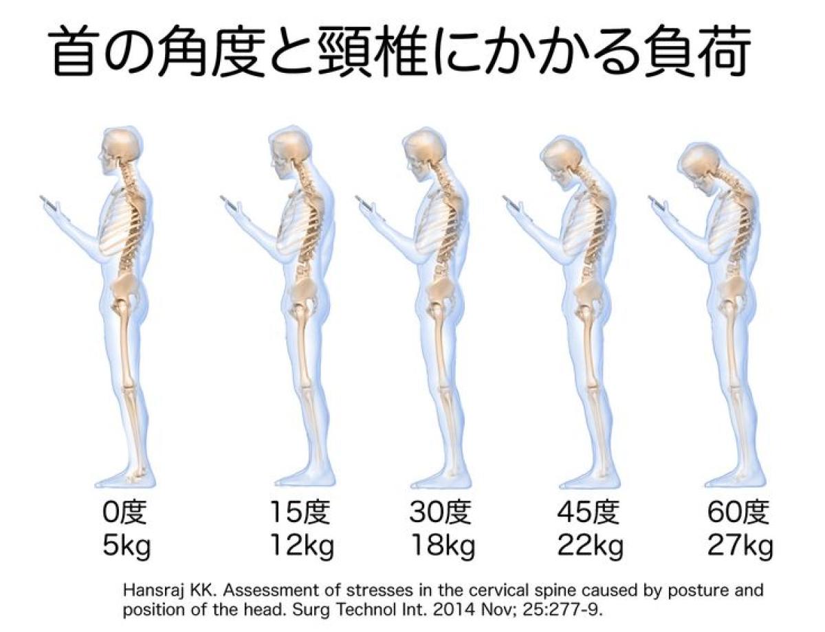 猫背になると、くびの角度によって首肩の筋肉や関節に大きな負担がかかります(写真参照)。そのため、首肩の痛みやこりが発生しやすくなります。また、緊張型頭痛といわれる筋緊張由来の頭痛が発生することもあります。